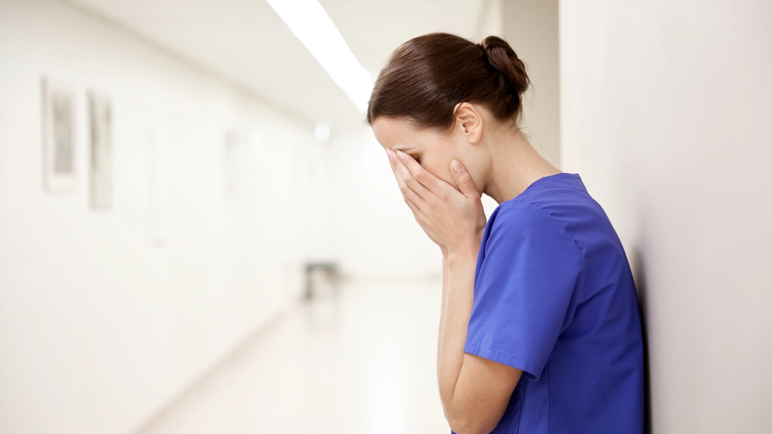 Una enfermera con las manos sobre el rostro, en una imagen de archivo