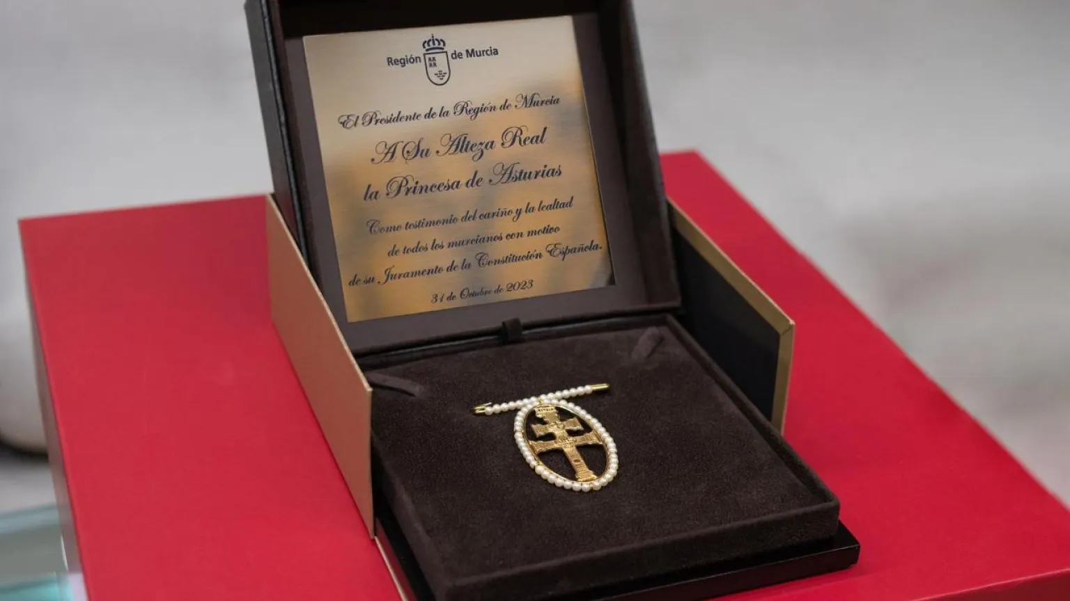 Con motivo de la mayoría de edad de Su Alteza Real y coincidiendo con la jura de la Constitución, el presidente de la Región de Murcia quiso hacer entrega de un obsequio a la Princesa de Asturias: un broche de oro y perlas de la Santísima y Vera Cruz de Caravaca de la Cruz hecho en la Región de Murcia.