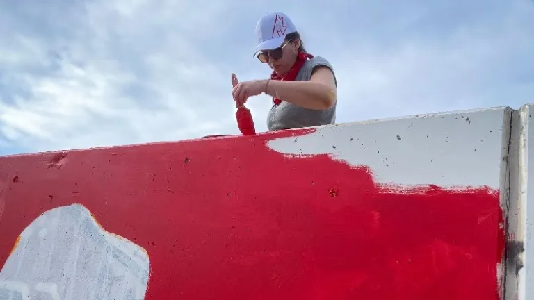 María Soledad González-Reforma, María de Todos los Santos Fernández y María Escarabajal, integrantes del colectivo Triple M Artists, ya se encuentran trabajando en los exteriores del estadio Enrique Roca, en la zona norte de la ciudad.