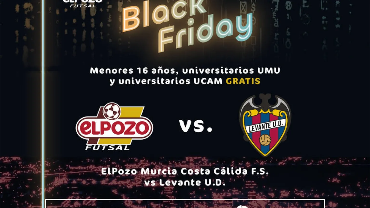 El Black Friday llega a ElPozo Murcia Costa Cálida FS con un partido de altura en el Palacio de los Deportes de Murcia. Tras el duelo ante el Barça este sábado, el conjunto murciano recibe el martes 23 de noviembre al Levante UD FS- subcampeón de Liga 2021- a las 19 horas y con una promoción especial para los menores de 16 años y la Comunidad Universitaria UMU y UCAM con acceso gratuito.