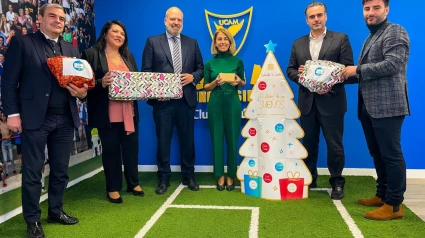 En la mañana de hoy ha tenido lugar el acto de entrega de los regalos en las oficinas del Estadio BeSoccer La Condomina, y al mismo han asistido Pablo Rosique, director General de Deportes de la UCAM; Francisco José Vives, gerente del UCAM Murcia CF; Rosa María Santa Cruz, responsable de Acción Social de CaixaBank en la Región de Murcia; Alicia Medina, técnico de Acción Social de CaixaBank en la Región; José Antonio Meseguer, responsable de Comunicación y Patrocinio de Región de Murcia; y Federico Ros, director de Instituciones de CaixaBank en la Región.