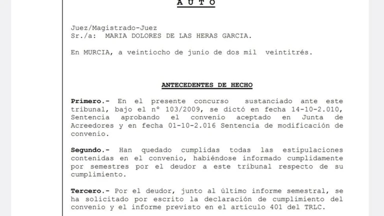 El Real Murcia C.F., S.A.D. informa de que el Juzgado de lo Mercantil número 1 de Murcia ha dictado el Auto de Cumplimiento del Concurso de Acreedores a la entidad. La entidad grana sigue dando pasos en el camino de su salvación y asegurar su futuro. Desde la llegada de Felipe Moreno se ha trabajado intensamente en lograr este hito.