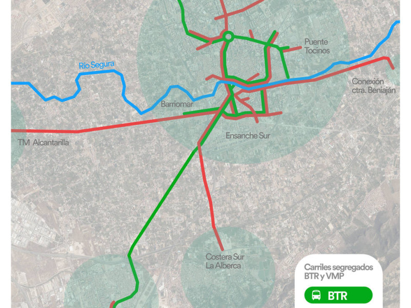 Para ello se dotará a la red viaria existente de carriles reservados en exclusiva al transporte público y a los Vehículos de Movilidad Personal, generando 43 kilómetros de carriles bus y 44 de carriles bici (22 por cada sentido), incluido en el plan ‘Murcia Pedalea' que prevé la construcción de 100 kilómetros de carril bici conectando Murcia con las pedanías