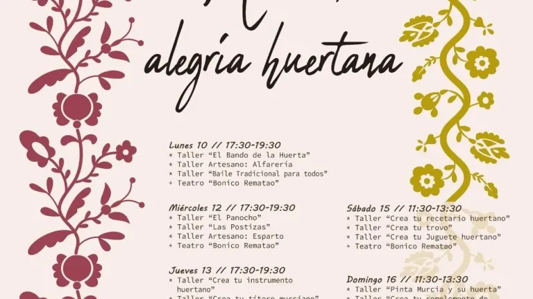 El jueves, 13 de abril, de 17.30 a 19.30 horas, se desarrollarán el taller 'Crea tu instrumento huertano', el taller 'Crea tu títere murciano' y el taller artesano 'Esparto'; y el viernes 14 de abril, de 17.30 a 19.30 horas, será el turno del taller 'Juegos Huertanos', del taller 'La Jota', y del taller artesano 'Alfarería'.
