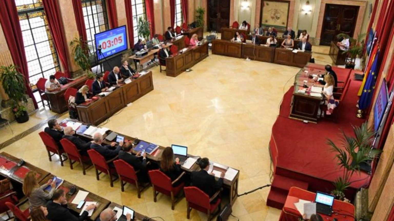 Parte de las intervenciones del pleno se han escuchado con dificultad, ya que a las puertas de la Casa Consistorial, en la glorieta de España, se concentraban representantes del sindicato de funcionarios públicos SIME, que han exigido con una ruidosa protesta mejoras en sus condiciones laborales.