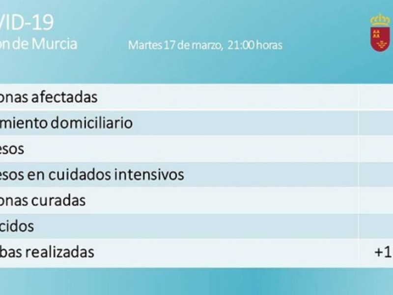 42 nuevos positivos han elevado a lo largo de este martes a 145 los casos de coronavirus detectados en la región de Murcia, cinco de ellos en la unidad de cuidados intensivos, tres más que esta mañana, y 21 en planta, cuando eran 18 al principio de la jornada.