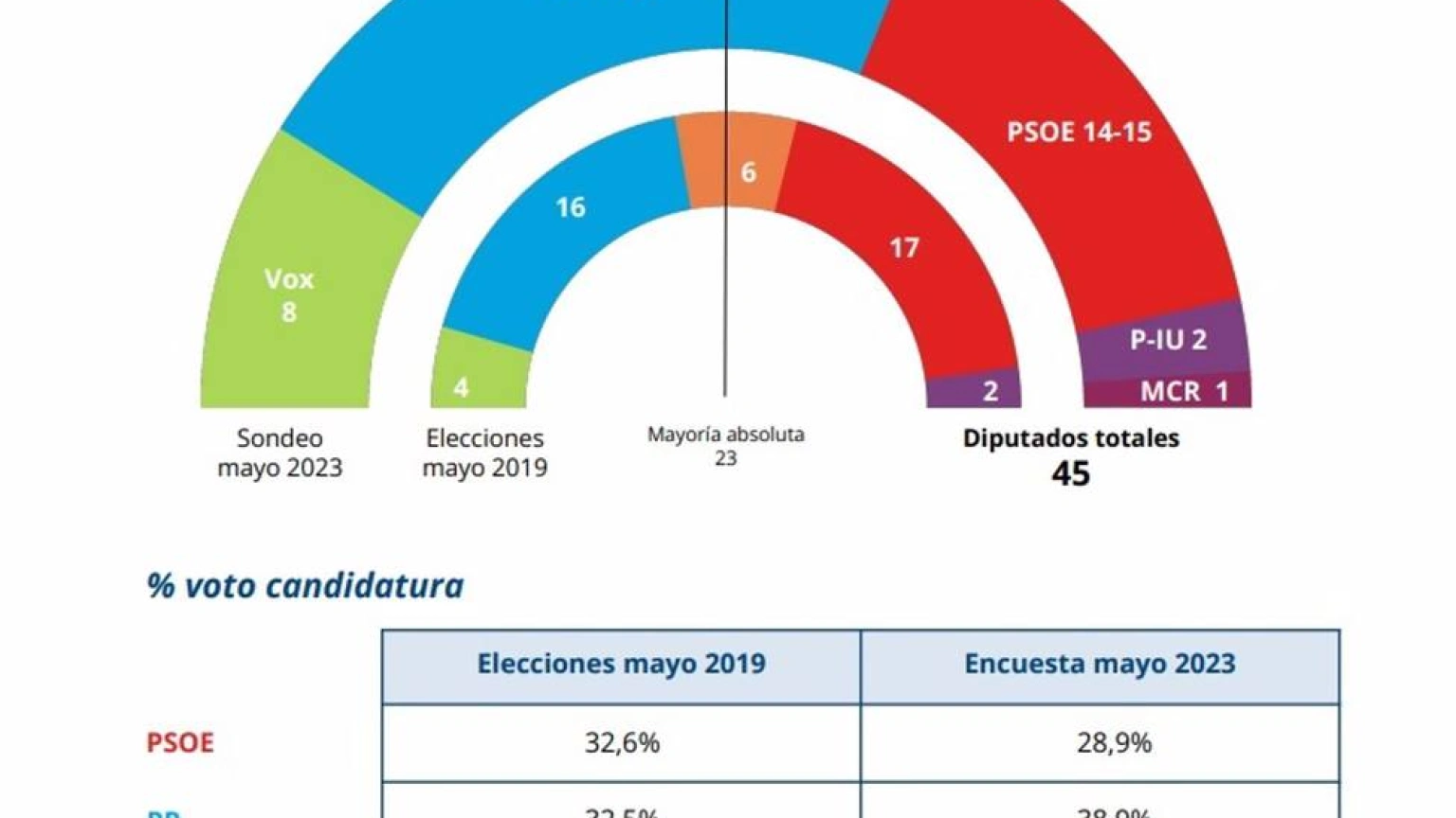 Obtendría entre 19 y 20 escaños mientras el PSOE conseguiría 14 o 15 diputados, Podemos-IU-Alianza Verde 2, Cs desaparecería y MC irrumpiría con uno