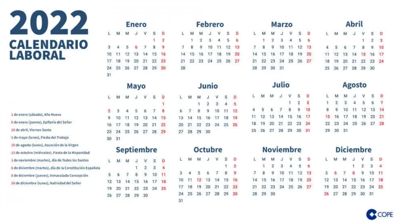 El calendario laboral de 2022 recoge un total de 12 días festivos nacionales, uno más que en 2021, de los que solo 8 se celebrarán de forma conjunta en toda España. En otros cuatro festivos comunes, el jueves 14 de abril (Jueves Santo), el lunes 2 de mayo (lunes siguiente a la Fiesta del Trabajo), el lunes 25 de julio (Santiago Apóstol) y el 26 de diciembre (lunes siguiente a la Natividad del Señor), las comunidades autónomas pueden desplazar su celebración. A los días festivos nacionales hay que sumar los festivos autonómicos y locales.