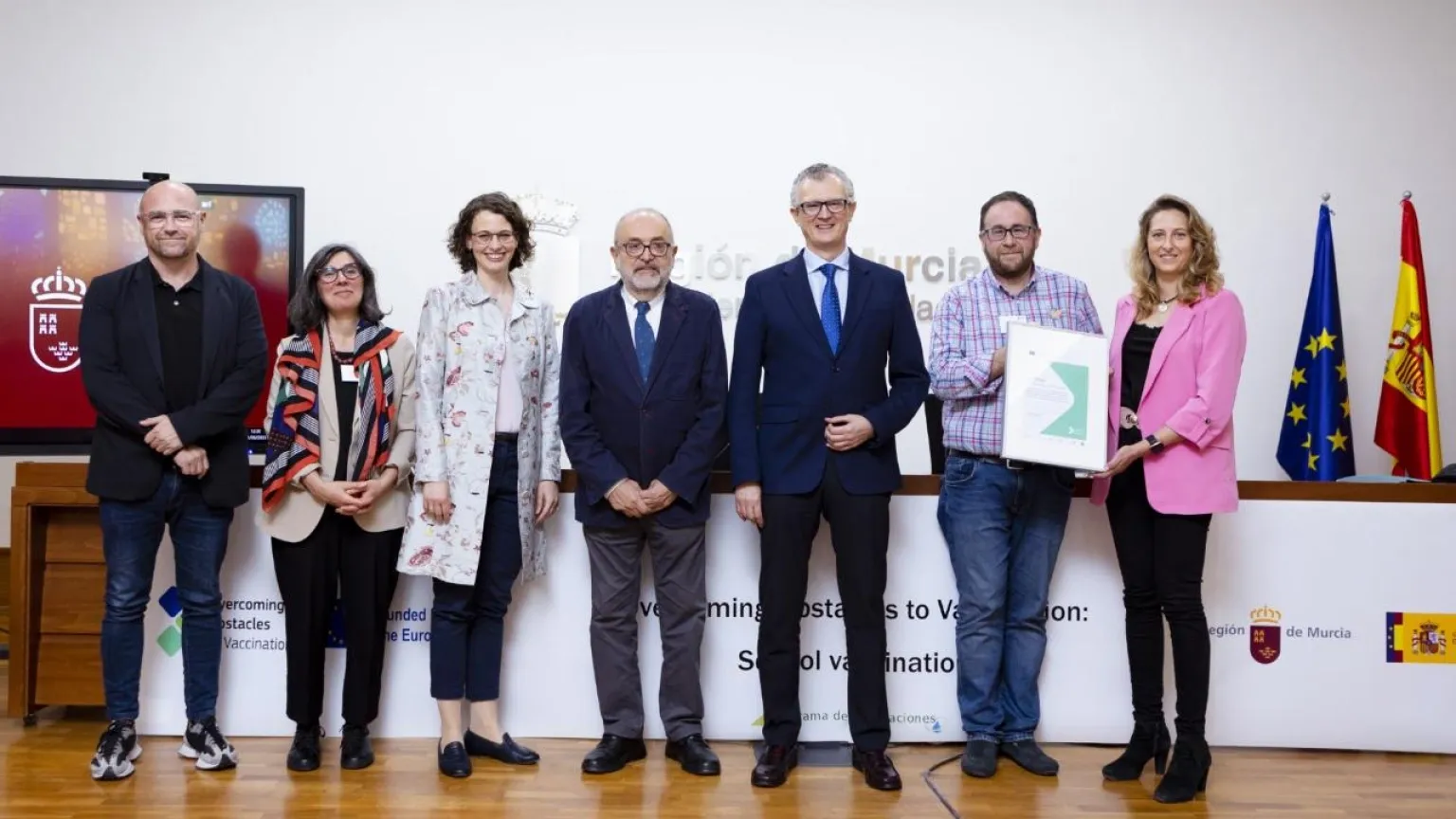 El Programa de Vacunación Escolar de la Región de Murcia fue reconocido por la Agencia Digital y de Salud Europea (HaDEA) como una de las prácticas más prometedoras del proyecto ‘Superar los obstáculos de la vacunación’. Así, la Unión Europea entregó este reconocimiento en un encuentro organizado en la Consejería de Salud, aprovechando la visita de una treintena de técnicos de diferentes países que se encuentran en la Región para conocer la implantación del programa.