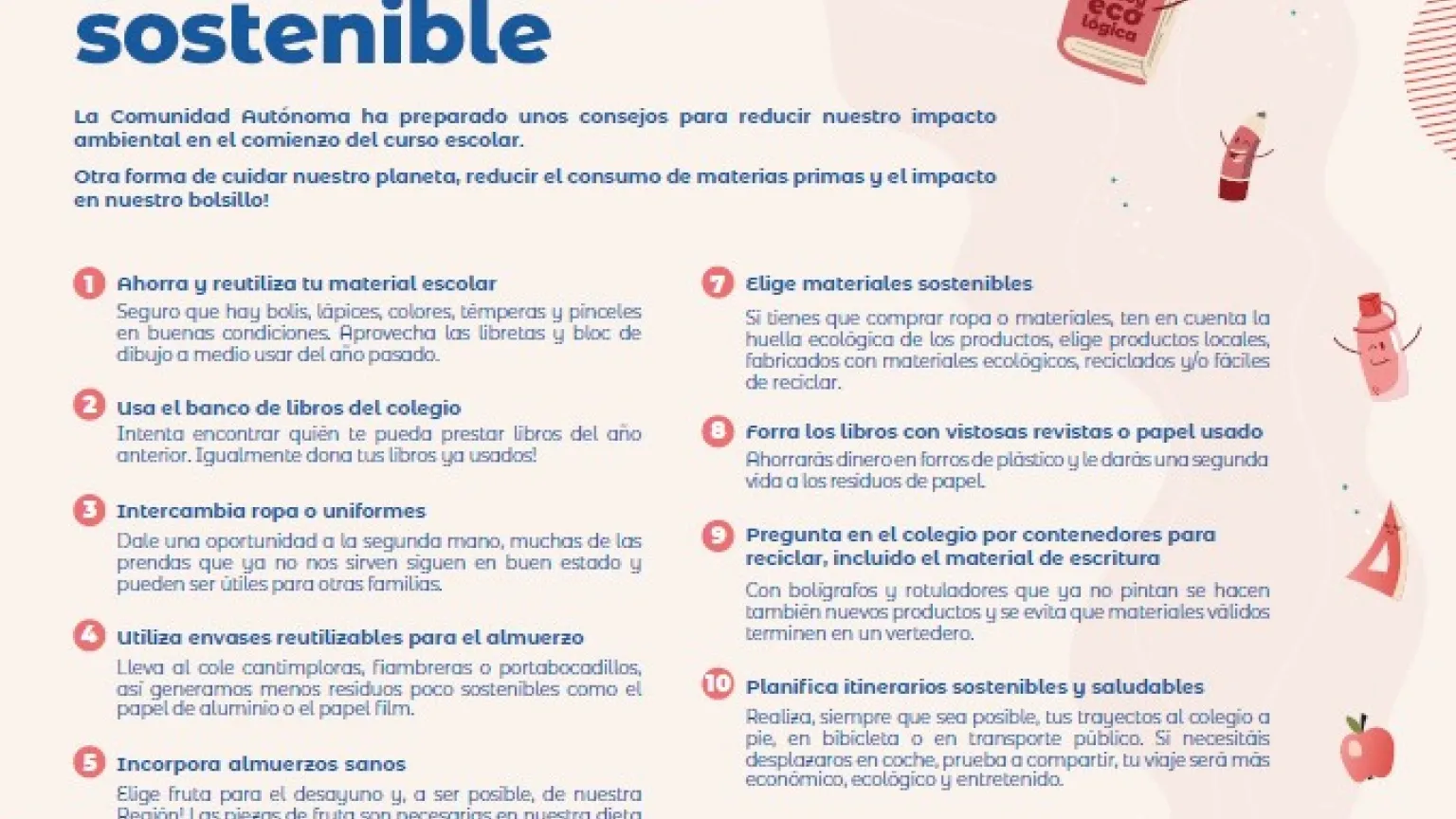El Gobierno regional, con motivo del inicio del curso escolar, lanza un decálogo de consejos prácticos para una ‘Vuelta al cole sostenible’. Con estas recomendaciones se pretende dar pautas y alternativas para reducir la huella ecológica de la comunidad escolar.