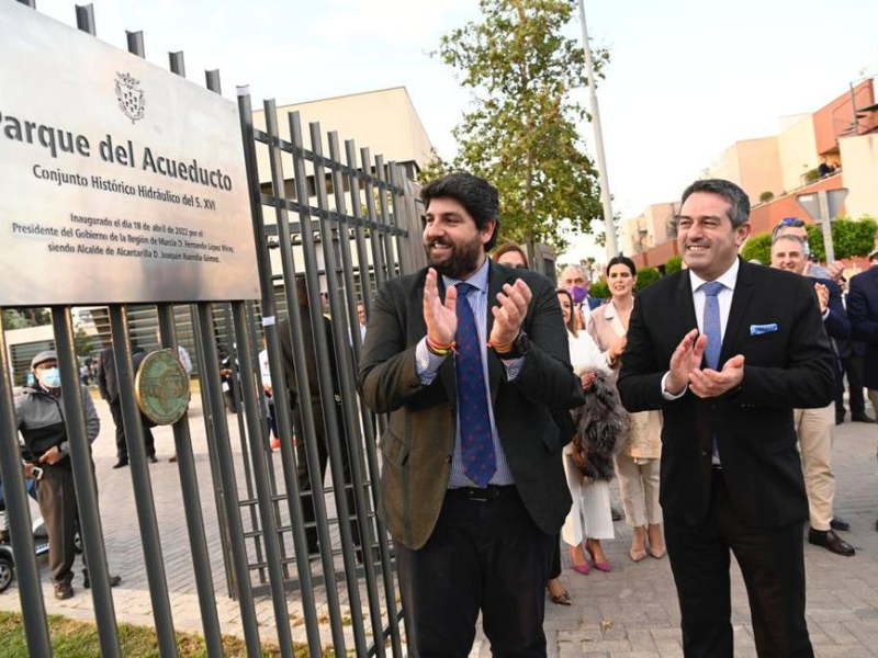 El alcalde de Alcantarilla, Joaquín Buendía, y el presidente de la Región de Murcia, Fernando López Miras, descubrieron la placa conmemorativa del que es “el mayor parque de la ciudad, con 43.700 metros cuadrados de zonas verdes que unen algunas de las joyas patrimoniales más importantes de Alcantarilla, como son el Acueducto, la Noria y el Museo de la Huerta, declarados Zona de Interés Cultural”, explicó Buendía.