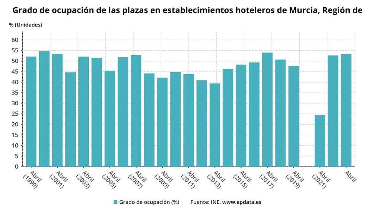 Así, las pernoctaciones registradas en la Región han contado con una estancia media de 2,39 días, un 0,8% más que en abril de 2022, y un grado de ocupación por plazas de 53,4%, lo que la ha situado en octava posición en el ranking de comunidades autónomas, mientras que la media nacional ha sido del 59,87%.