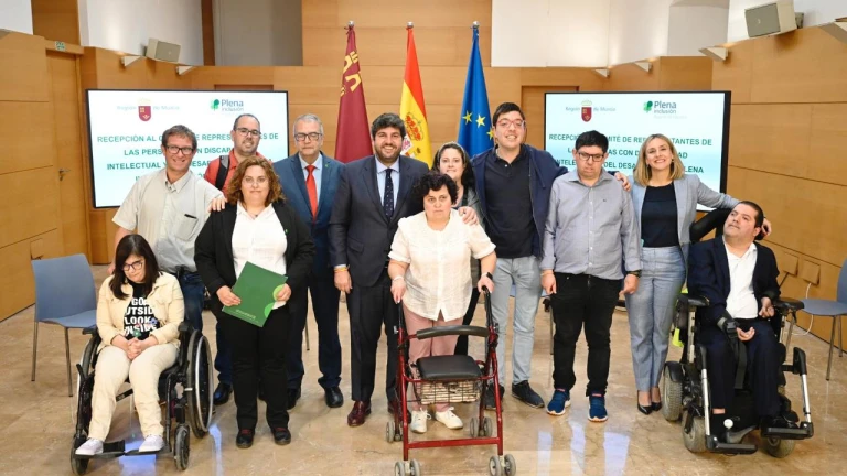 El presidente del Gobierno regional, Fernando López Miras, recibió hoy en el Palacio de San Esteban a los miembros del comité de representantes de las personas con discapacidad intelectual y del desarrollo de Plena Inclusión Región de Murcia, que es la federación que aglutina a las asociaciones de familias de personas con discapacidad intelectual.