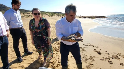 Una tortuga boba fue liberada hoy en la playa de Calblanque tras su paso por el Centro de Recuperación de Fauna Silvestre ‘El Valle’, momento que presenció el consejero de Medio Ambiente, Mar Menor, Universidades e Investigación, Juan María Vázquez.