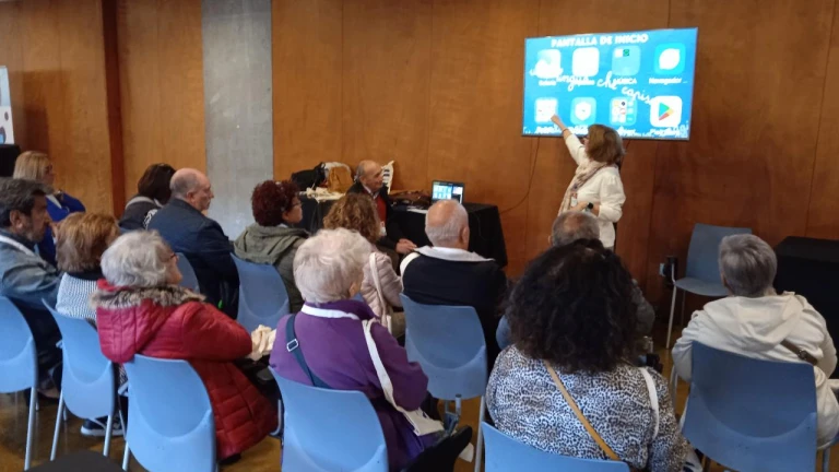 En este evento, que tiene lugar hoy y mañana, los mayores pueden asistir a los múltiples talleres que existen. Desde el Instituto Alcántara, su profesora Carmen Ruiz coordinaba varios de ellos, por ejemplo, sobre aplicaciones que sirven para encontrar llaves, sacar dinero del banco, pagar las multas por Internet o tomarse las pastillas correctas cada día. Otro de los talleres se centraba en la utilización de los teléfonos móviles.