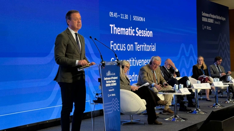 Ortuño centró su intervención en dos cuestiones estratégicas para el futuro de Europa: cómo integrar competitividad y resiliencia climática, y cómo fortalecer la preparación en defensa desde una perspectiva territorial. Recordó que las regiones marítimas “están en primera línea frente al cambio climático” y que la adaptación puede convertirse en motor económico gracias a inversiones en eficiencia hídrica, agricultura circular y restauración de ecosistemas.