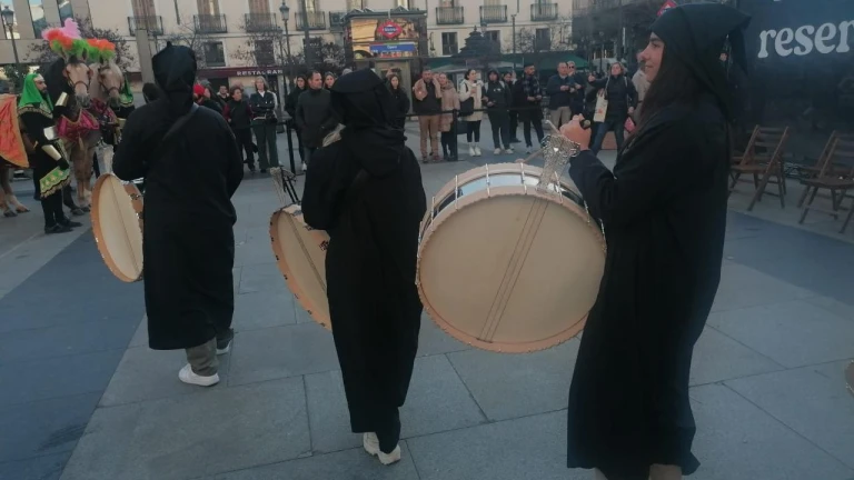 La plaza de Isabel II, junto al Teatro Real, es el escenario que recorren los carros del rey persa Asuero, del Paso Blanco, y del faraón Ptolomeo IV Filipator, del Paso Azul, cada uno de ellos tirados por dos caballos.