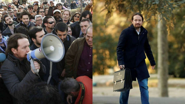Este es parte del recorrido de la formación que nació el 15M y ahora ocupan las sillas del Consejo de Ministros con cuatro carteras ministeriales y una vicepresidencia. Un tuitero ha querido resumirlo con dos fotos.