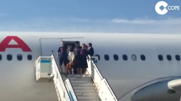 Los capitanes Xavi e Iniesta fueron los primeros en salir del avión que salía de Berlín con la quinta Copa de Europa del Barcelona.
