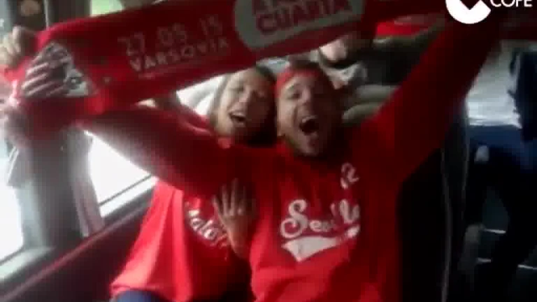 Los aficionados sevillistas celebran la entrada del autobús en Polonia entonando el tradicional himno del centenario. Falta menos para la soñada meta de Varsovia.