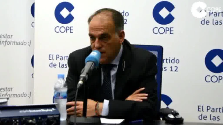 El presidente de la LFP visitó los estudios de la Cadena Cope, donde habló del futuro del Elche, de la sanción del Sevilla y los horarios de la Liga de la próxima temporada: "En el ámbito de la Liga el Elche no se salvaría, solo si se le estima una medida cautelar. La sanción al Sevilla me parece desmesurada, cuatro partidos es exagerado. Tienen que poner el recurso. Algo pueden cambiar los horarios la próxima temporada. Se investiga si lo que dijo Lopo al final del Barça-Elche es susceptible de sancionar".