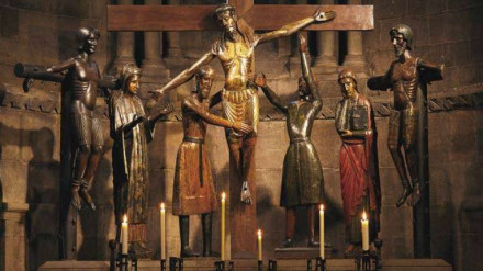 Eva Galvache entrevista hoy en El Espejo a David Comta, rector de Sant Joan de les Abadesses (Gerona) con motivo de los actos por los mil años de la extinción de la que fue la primera fundación de un monasterio femenino en Cataluña. En la foto: grupo escultórico conocido como el "Santísimo Misterio".
