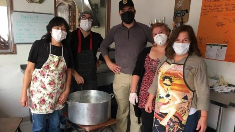 Cumpliendo estrictamente las normas de higiene, los voluntarios preparan entre 80 y 130 bandejas de comida, que luego reparten a las personas que viven en la calle, en la conocida Plaza Echaurren. La emergencia ha dejado desamparadas a muchas personas que trabajan de manera informal cuidando vehículos y haciendo otras labores, que ahora no tienen ninguna remuneración.