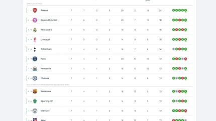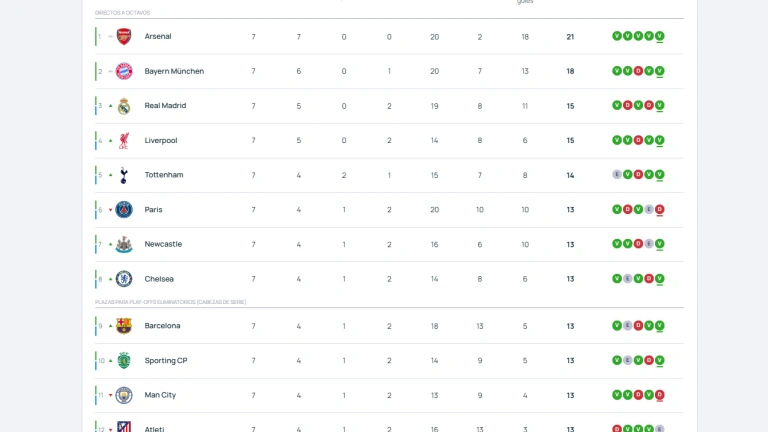 A día de hoy, solo dos equipos en Europa tienen asegurada su presencia en el top 8 antes de disputar la última fecha. Se trata del Arsenal, que lidera la tabla con 21 puntos tras haberlo ganado todo, y el Bayern de Múnich, que suma 18 puntos después de su última victoria.