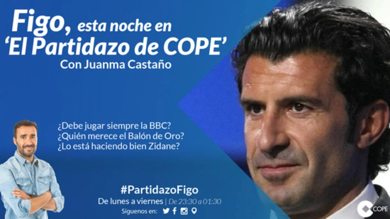 El ex futbolista portugués visita esta noche El Partidazo de COPE, que dirige Juanma Castaño. ¿Debe jugar siempre la BBC?, ¿quién merece el Balón de Oro?, ¿lo está haciendo bien Zidane?, o su pasado como jugador del Barcelona y del Real Madrid serán algunas de las preguntas que le plantearemos a Figo, a partir de las 23:30 horas.