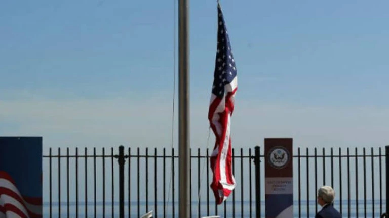 El secretario estadounidense de Estado, John Kerry, en la ceremonia de izado de la bandera estadounidense en la embajada de Cuba. EFE