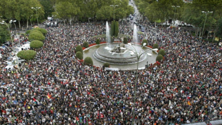 Vista de la plaza de Neptuno de Madrid donde un gran número de personas se congregaron en septiembre de 2012, convocados por la Coordinadora 25S dentro de la iniciativa Rodea el Congreso. EFE