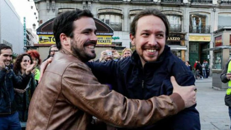Fotografía colgada por Izquierda Unida (IU) en la red social Twitter de los líderes de Podemos, Pablo Iglesias (d), y de IU, Alberto Garzón (i), dándose un abrazo en la Puerta del Sol. EFE