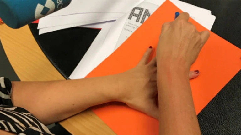 Cristina ya está marcando sus manos en la cartulina.