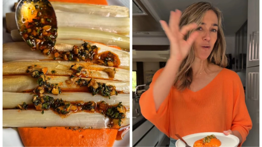 El montaje final consiste en crear una base con la crema de piquillos en un plato, colocar los puerros horneados encima y decorar con la picada. "Es un bocado que queda buenísimo, que lo podemos hacer incluso para cenar", ha asegurado la colaboradora, ya que es una receta "súper saciante" por la combinación de la proteína del huevo y la fibra del puerro.