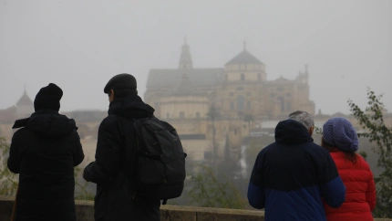 La niebla cubre el Puente Romano de Córdoba este jueves. La llegada de una borrasca por el noroeste de la península, junto con vientos húmedos atlánticos, dejará este jueves un día marcado por la inestabilidad
