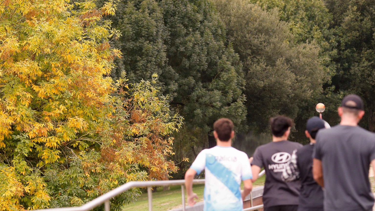 Una acogedora terraza de cafetería o restaurante con mesas y sillas en un día de otoño.