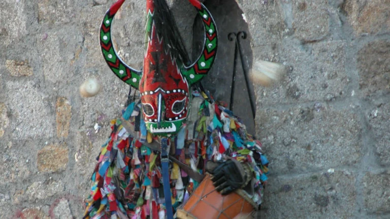 Este sonido es el de las verduras impactando contra el colorido traje de este personaje. También contra la máscara, muy llamativa, al estilo africano. Tanto el vestido como la máscara están hechas de fibra de carbono para aguantar las embestidas. Y a pesar de los golpes, los vecinos hacen cola para representarlo. Tanto es así que hay lista de espera para los próximos 20 años.