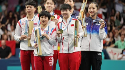 A un lado, la pareja que ha representado a Corea del Norte en la prueba de dobles mixtos de tenis de mesa en los JJ. OO. de París. En el otro, la pareja de Corea del Norte.