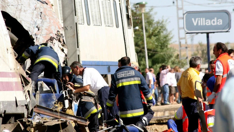 Efectivos de los Servicios de Emergencias atienden sobre las vías del tren a los heridos tras el descarrilamiento en Villada