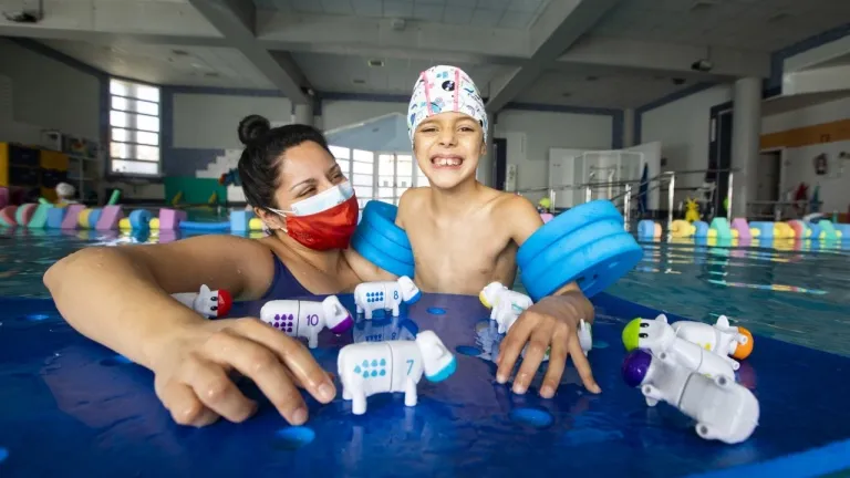 25 niños y jóvenes con discapacidad intelectual juegan y realizan actividades dentro de una piscina terapéutica