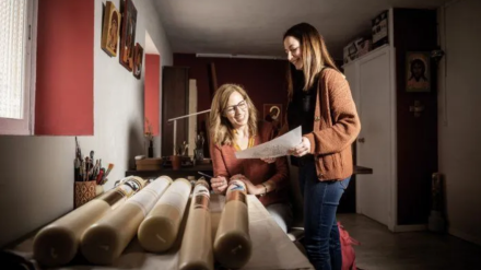 Elena abrió su taller cuando le encargaron conseguir un cirio para su parroquia. Ahora la ayuda su hija Débora.
