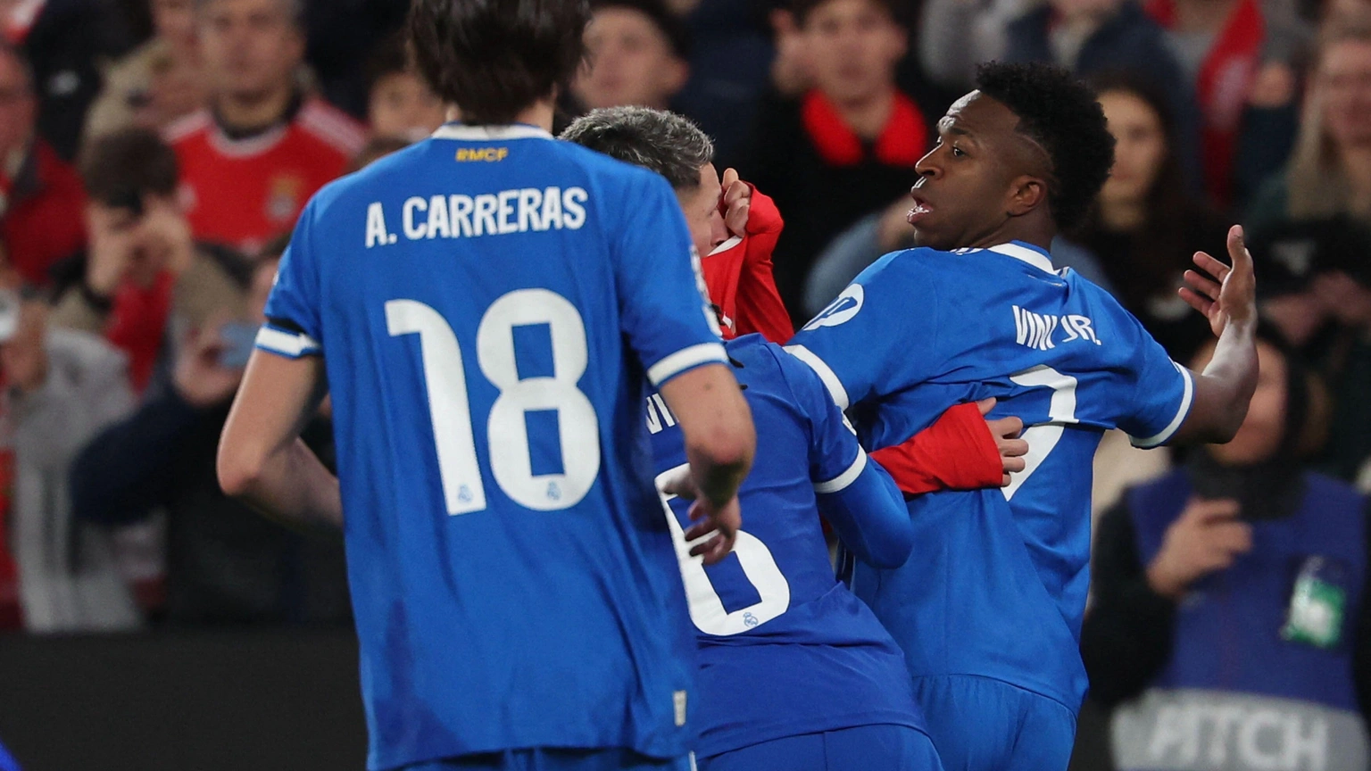 Lisbon (Portugal), 17/02/2026.- Benfica's head coach Jose Mourinho (C-L) speaks with Real Madrid's Vinicius Junior who walked off the pitch after dennouncing racism in the stands to the referee during the UEFA Champions League soccer match between Benfica and Real Madrid, in Lisbon, Portugal, 17 February 2026. (Liga de Campeones, Lisboa) EFE/EPA/JOSE SENA GOULAO