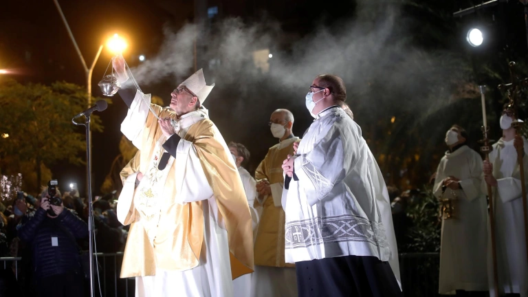 El arzobispo de Barcelona ha bendecido este miércoles la Torre de la Virgen María para luego iluminar a toda la ciudad condal