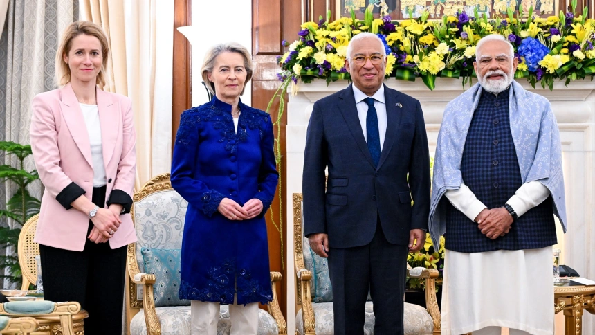 El presidente del Consejo Europeo, António Costa; el primer ministro de India, Narendra Modi; y la presidenta de la Comisión Europea, Ursula von der Leyen, tras anunciar un acuerdo de libre comercio entre la UE e India