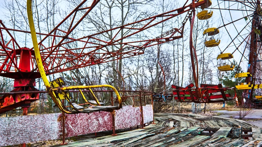 Antigua noria en la ciudad fantasma de Pripyat. Consecuencias del accidente en la central nuclear de Chernóbil.
