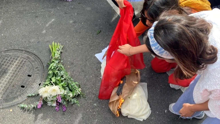 Varios velos ardiendo sobre el suelo justo al lado de la puerta de la embajada se convierten en el símbolo de esta manifestación. Una de las encargadas de quemar estas prendas es Latika. Es india y se ha acercado a este punto para apoyar a las mujeres de Irán en su protesta.