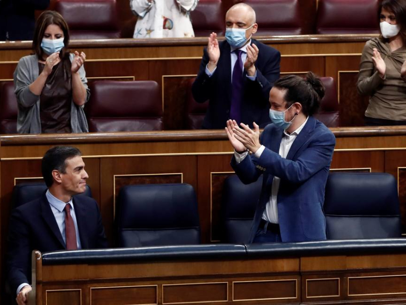 El presidente del Gobierno, Pedro Sánchez, es aplaudido por el vicepresidente segundo, Pablo Iglesias (d). EFE/Mariscal