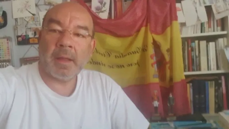 El periodista empieza comentando una bandera de España muy especial que le regalaron “hace unos meses unos amigos de Asociación Pro Guardia Civil”. La enseña, de tela, mide aproximadamente un metro y medio por un metro y contiene el escudo constitucional en la franja amarilla de la bandera y un lema al lado: “La Guardia Civil muere pero no se rinde”.