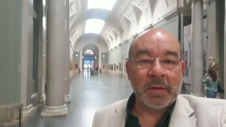 Ángel Expósito, director de ‘La Linterna’ en COPE, graba su videoblog de este viernes desde el Museo del Prado de Madrid. El comunicador asegura que “nunca jamás podía pensar que se visitara el Museo del Prado así”, haciendo referencia a la escasa afluencia de pública, debido a la ausencia de turistas y las restricciones impuestas para combatir contra el coronavirus.