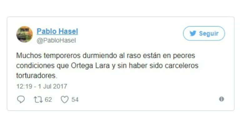 Monólogo de Ángel Expósito a las 17h. El rapero Pablo Hasel escribe un tuit: "muchos temporeros durmiendo al raso están en peores condiciones que Ortega Lara y sin haber sido carceleros torturadores"...sin comentarios.